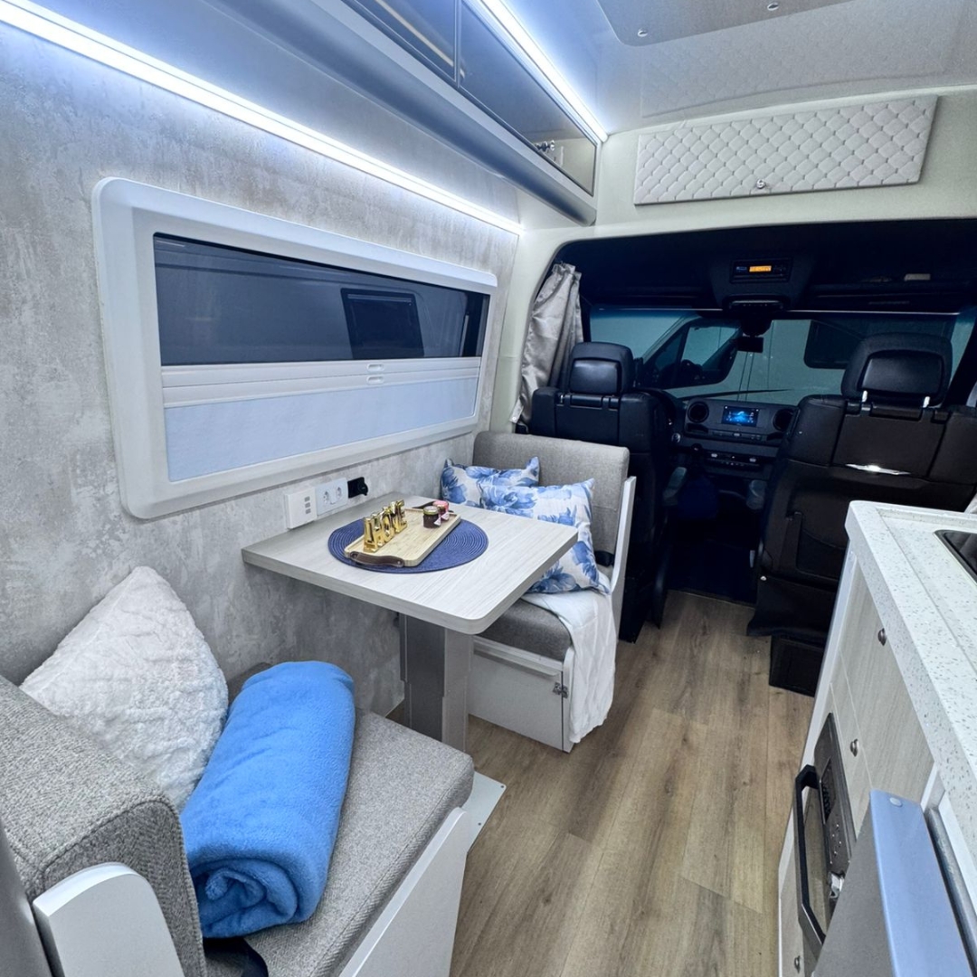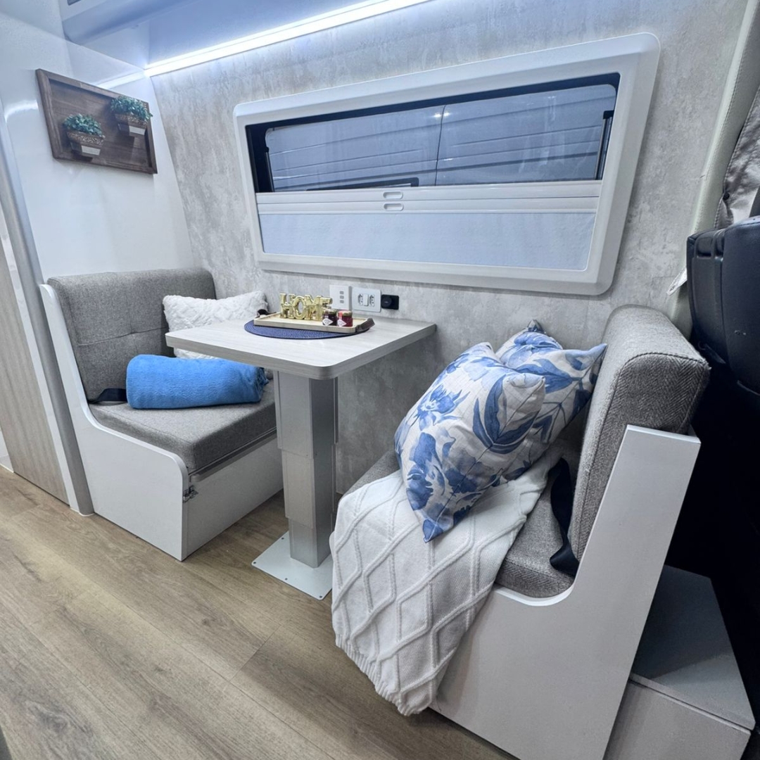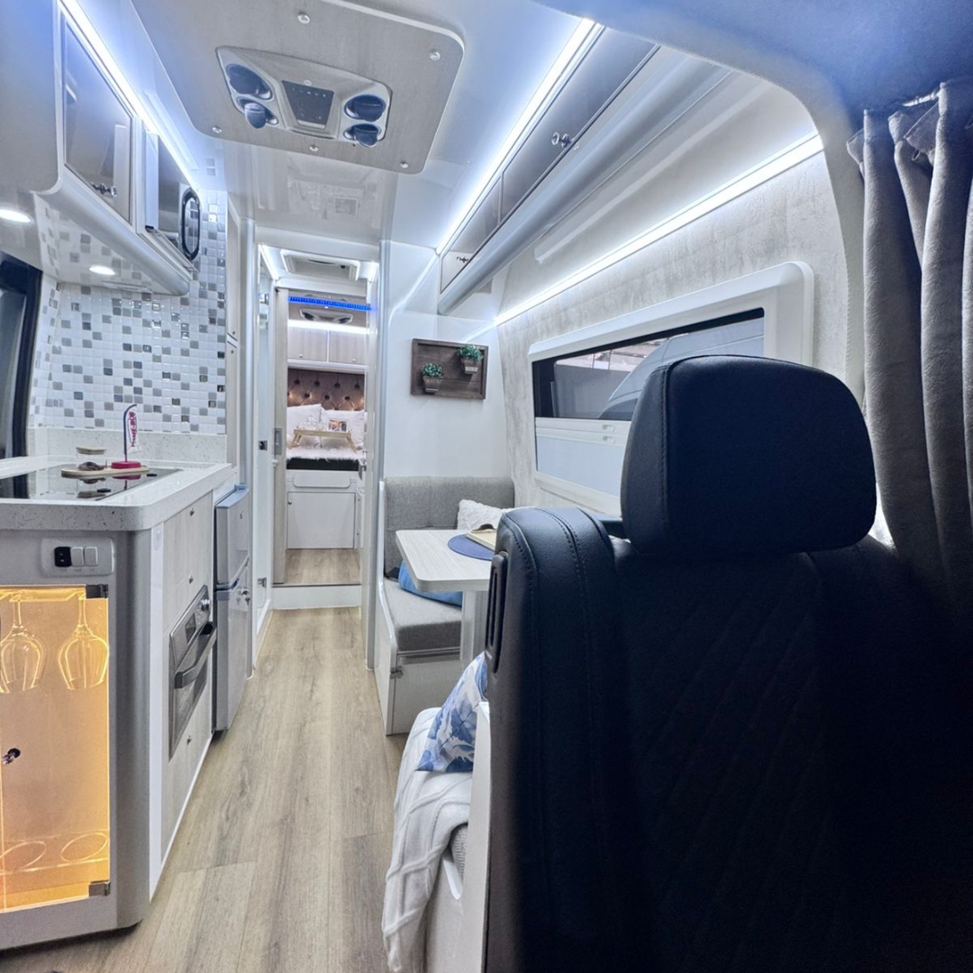 • Estrutura construída com móveis em compensado naval e fórmica, acabamento premium em ACM e courvin, e isolamento térmico.