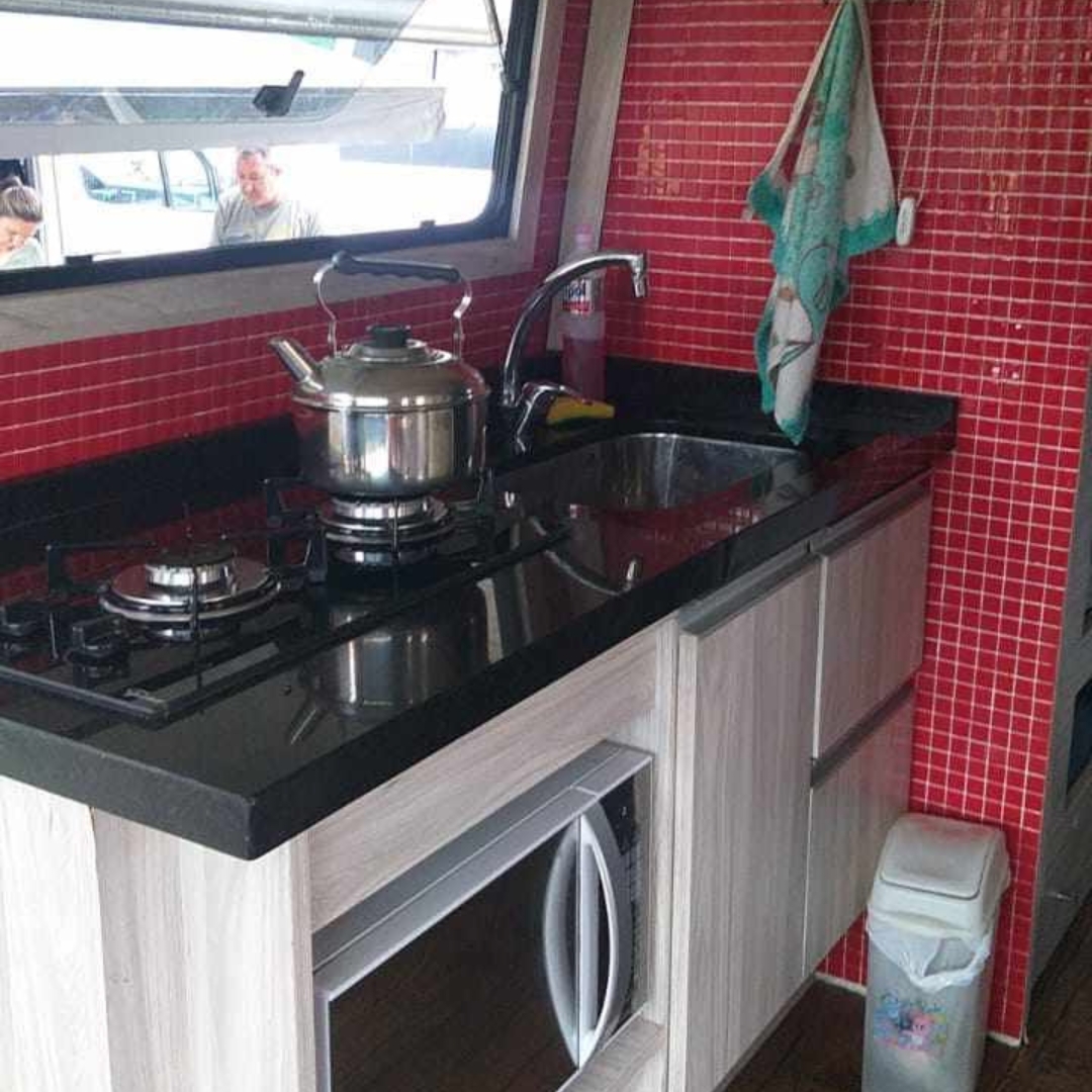 Cozinha COMPLETA: pia, fogão, geladeira, micro-ondas, mesa, bancos;